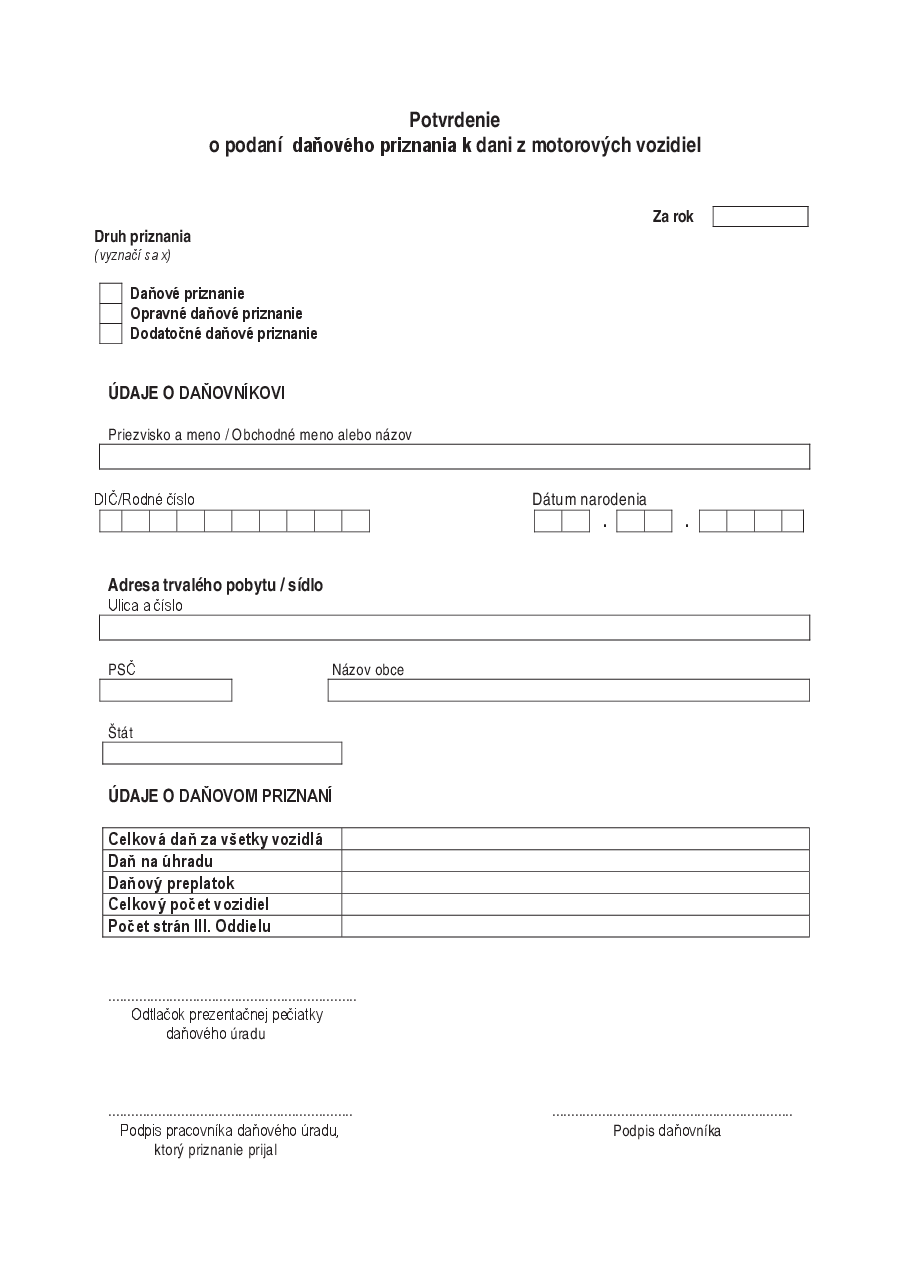 Toto tlačivo sa podáva na daňovom úrade do 31.01.2026. Vyplňte si tlačivo pre Daň z motorových vozidiel.