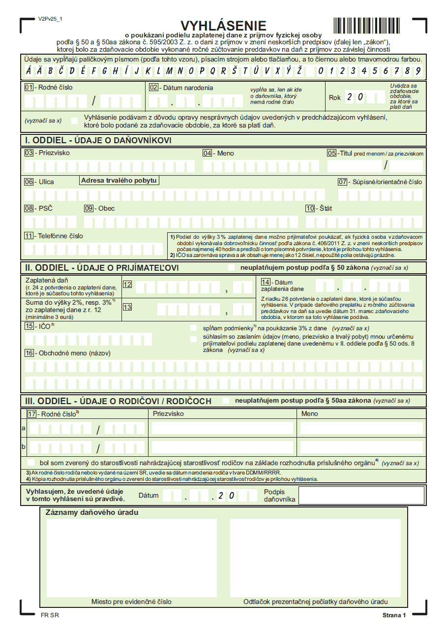 na vyplnenie vyhlásenia o poukázaní podielu zaplatenej dane z príjmov fyzickej osoby podľa § 50 a 50aa zákona č. 595/2003 Z. z. o dani z príjmov v znení neskorších predpisov