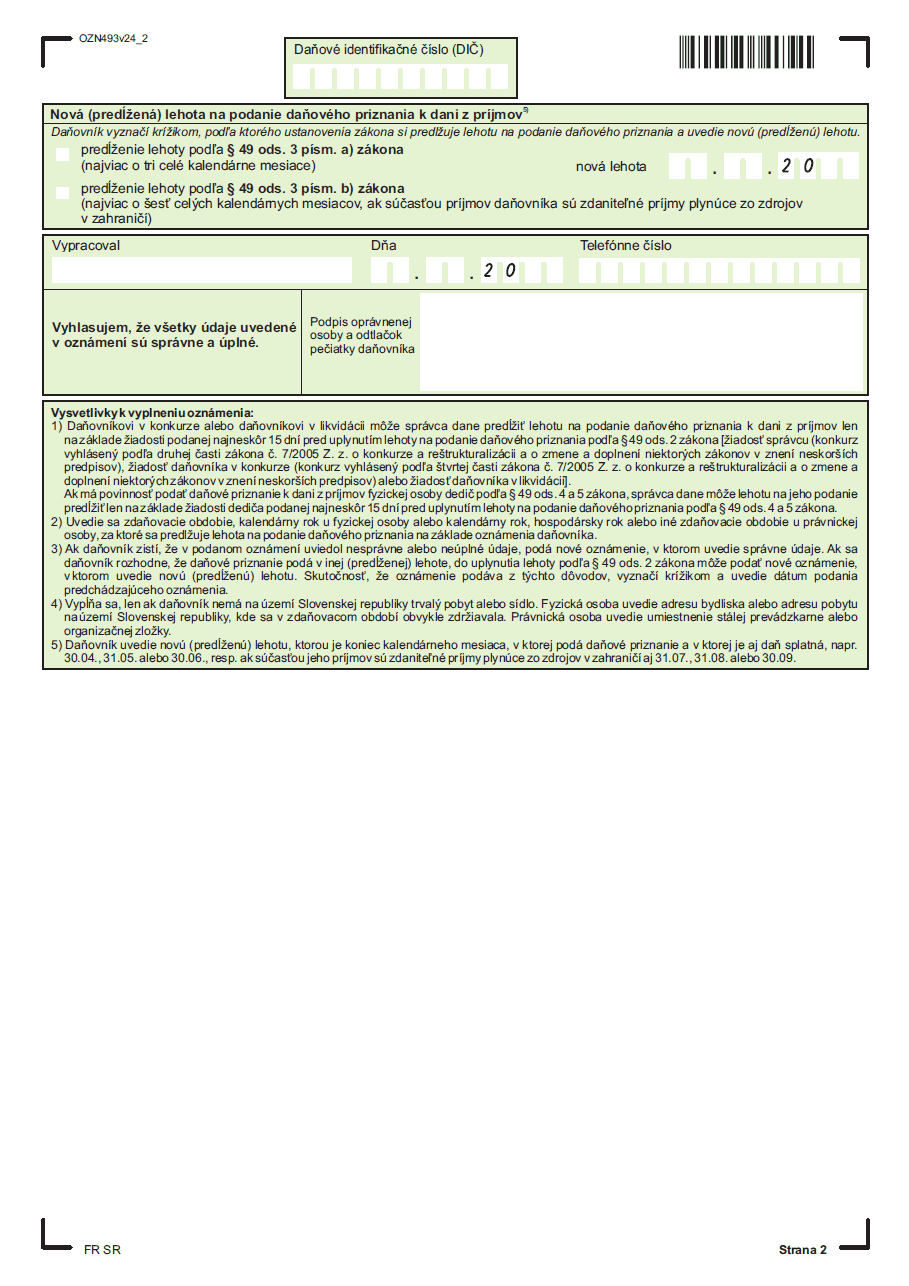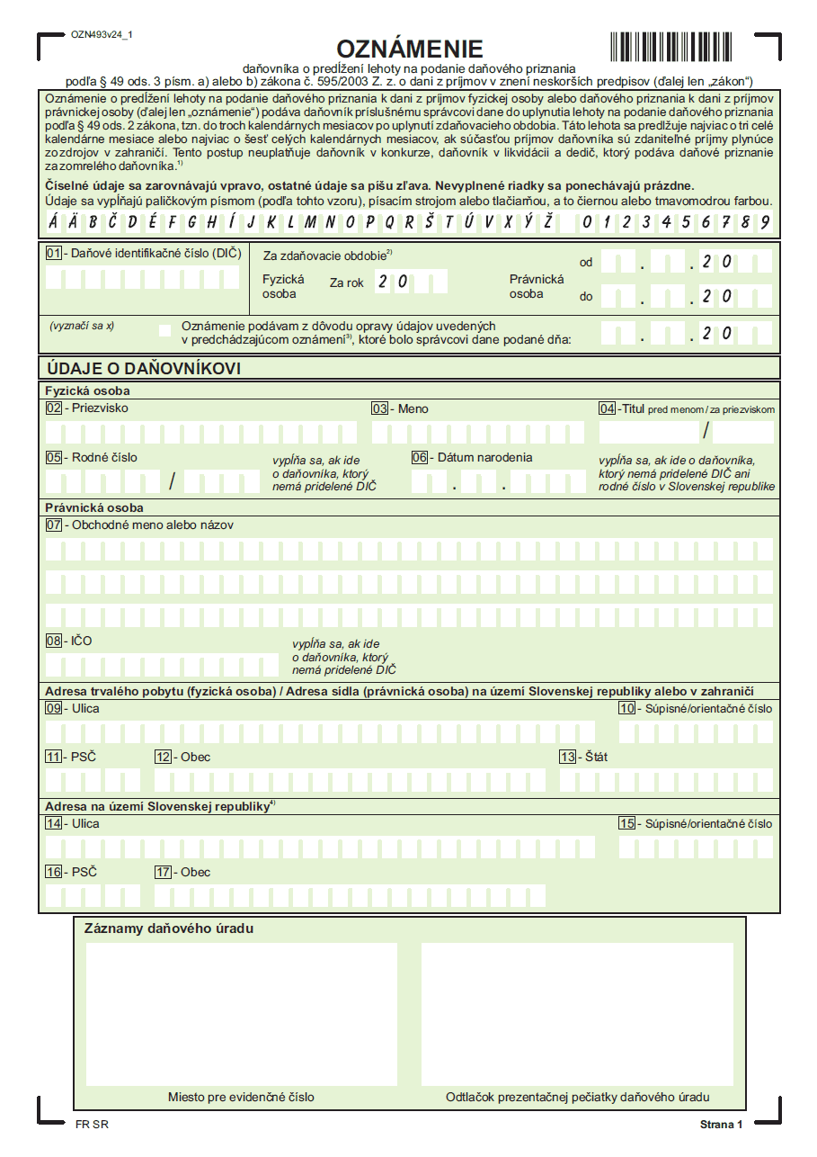 Oznámenie o predĺžení lehoty na podanie daňového priznania za rok 2024 je možné podať iba na predpísanom formulári Oznámenie daňovníka o predĺžení lehoty na podanie daňového priznania podľa § 49 ods. 3 písm. a) alebo b) zákona č. 595/2003 Z. z. o dani z príjmov v znení neskorších predpisov označené ako OZN493v24, ktoré je zverejnené aj v elektronickej podobe na webovom sídle Finančného riaditeľstva Slovenskej republiky, v časti Formuláre/Elektronické formuláre/Správa daní/Daň z príjmov fyzickej osoby.
