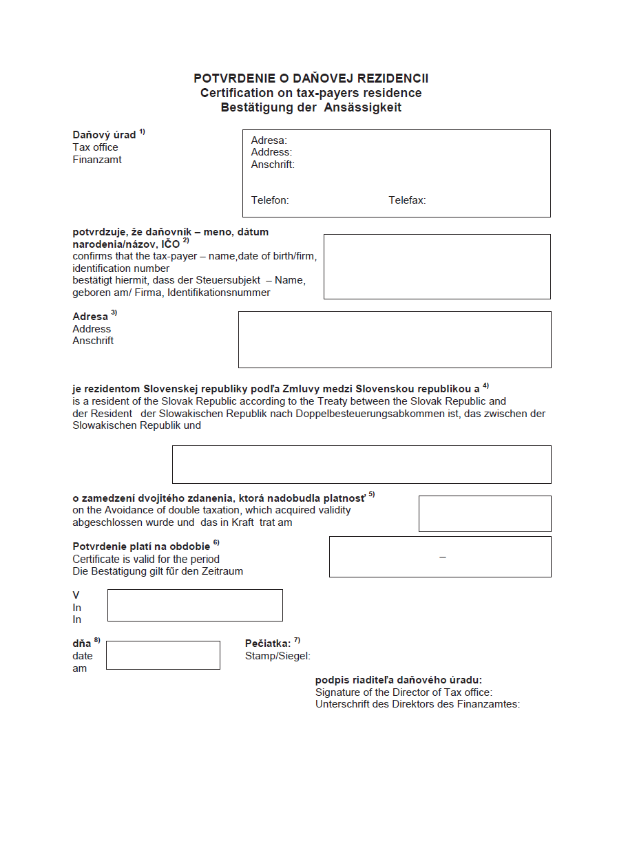 Daňový úrad vydáva Potvrdenie o daňovej rezidencii na základe podania Žiadosti o vydanie Potvrdenia o daňovej rezidencii.