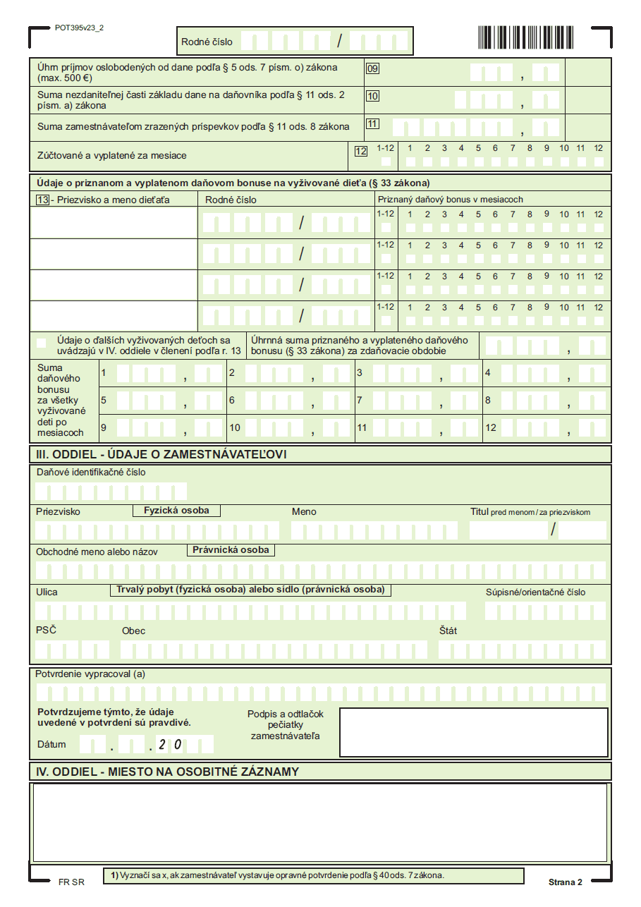 Zamestnávateľ vystaví a doručí potvrdenie zamestnancovi aj vtedy, ak tomuto zamestnancovi v zdaňovacom období poskytol len plnenia oslobodené od dane podľa § 5 ods. 7 písm. b), k), l) a o) zákona, ktoré sa uvádzajú na r. 05 až 09 tohto potvrdenia.