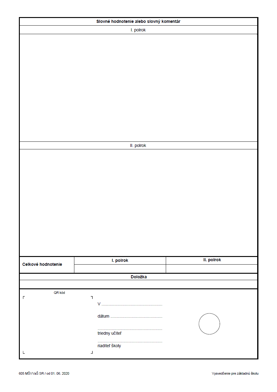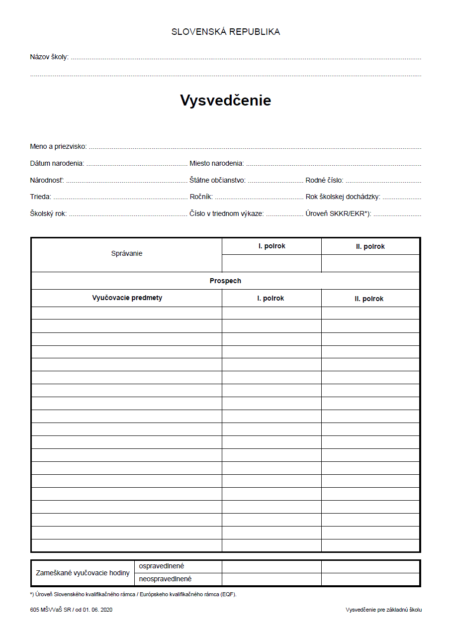 Vzor vysvedčenia pre ZŠ schválený Ministerstvom školstva SR od r. 2020. Súvisiace tlačivo je Diplom alebo Certifikát.