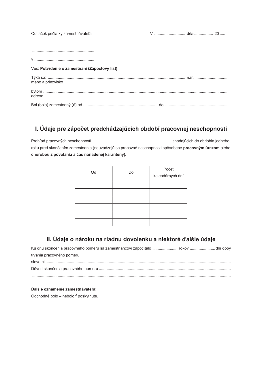 Súvisiace tlačivá sú Ukončenie pracovného pomeru dohodou, Dohoda o hmotnej zodpovednosti zamestnanca, Potvrdenie o príjmoch zamestnanca alebo Pracovná zmluva.