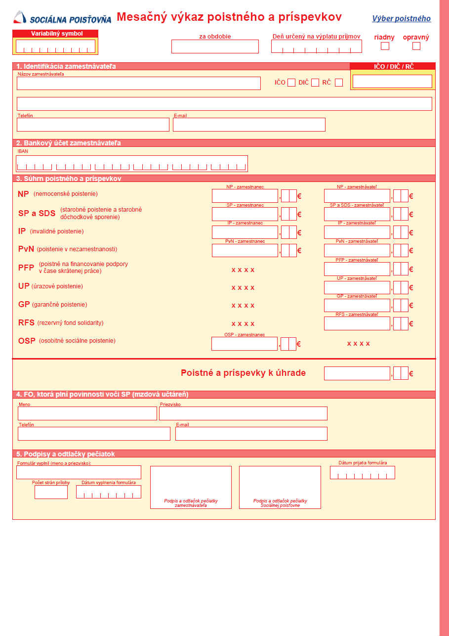 | Oddiel 1 | Variabilný symbol | Uveďte 10 miestne číslo VS (variabilný symbol) zamestnávateľa, pridelené pobočkou Sociálnej poisťovne pri registrácii zamestnávateľa. VS sa uvádza pri platbách poistného a povinných príspevkov a je povinným údajom. |