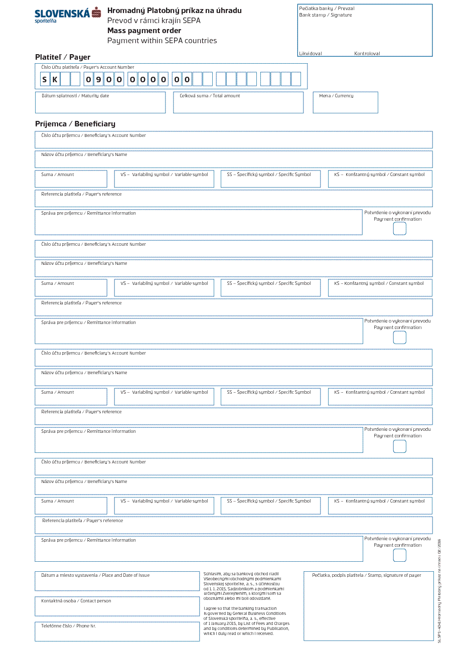 Tento formulár umožňuje vytvorenie hromadného príkazu na úhradu pre Slovenskú sporiteľňu a súčasne vygenerovanie dávkového súboru pre nahratie do elektronického bankovníctva. Na jednom formulári možno zadať 4 príjemcov, pričom vytvoriť možno 4 kópie formulára (tlačidlomnapravo), čo je [stále len] celkovo 16 prevodných príkazov.