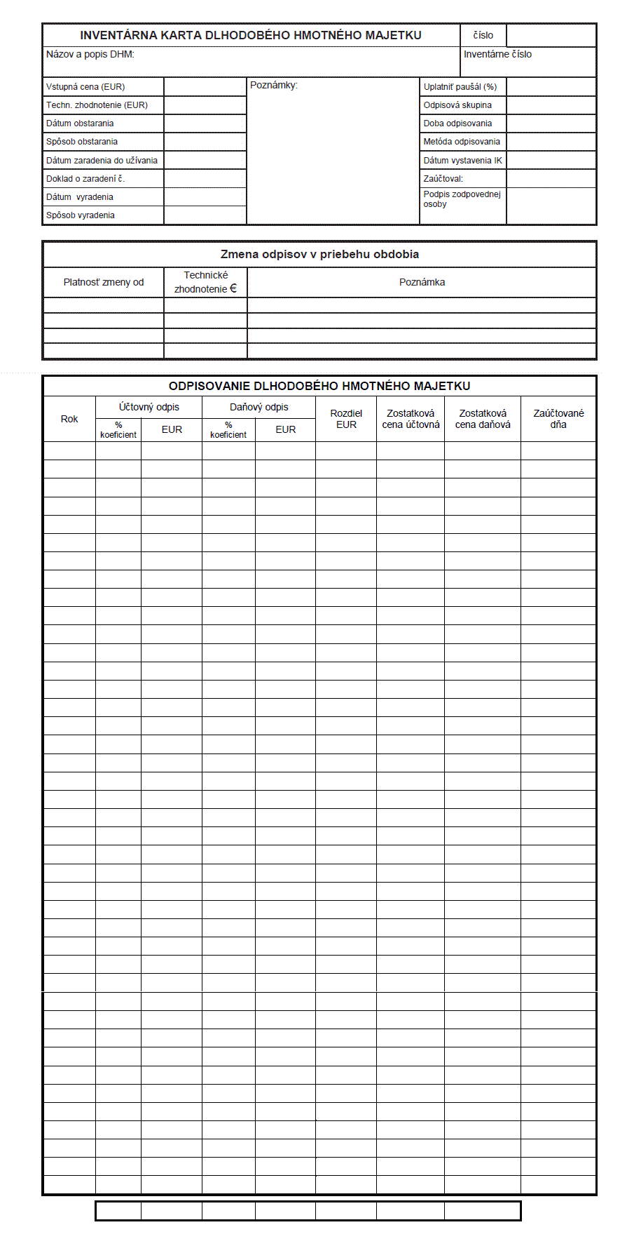 Vygenerujte si odpisy pre jednotlivé roky - nastavte vstupnú cenu majetku, odpisovú skupinu alebo dobu odpisovania, odpisovú metódu, dátum zaradenia a kliknite na "Vytvoriť plán odpisov". Súvisiace tlačivá sú Inventárna karta KHM, IK pre pozemok a Protokol o zaradení majetku.