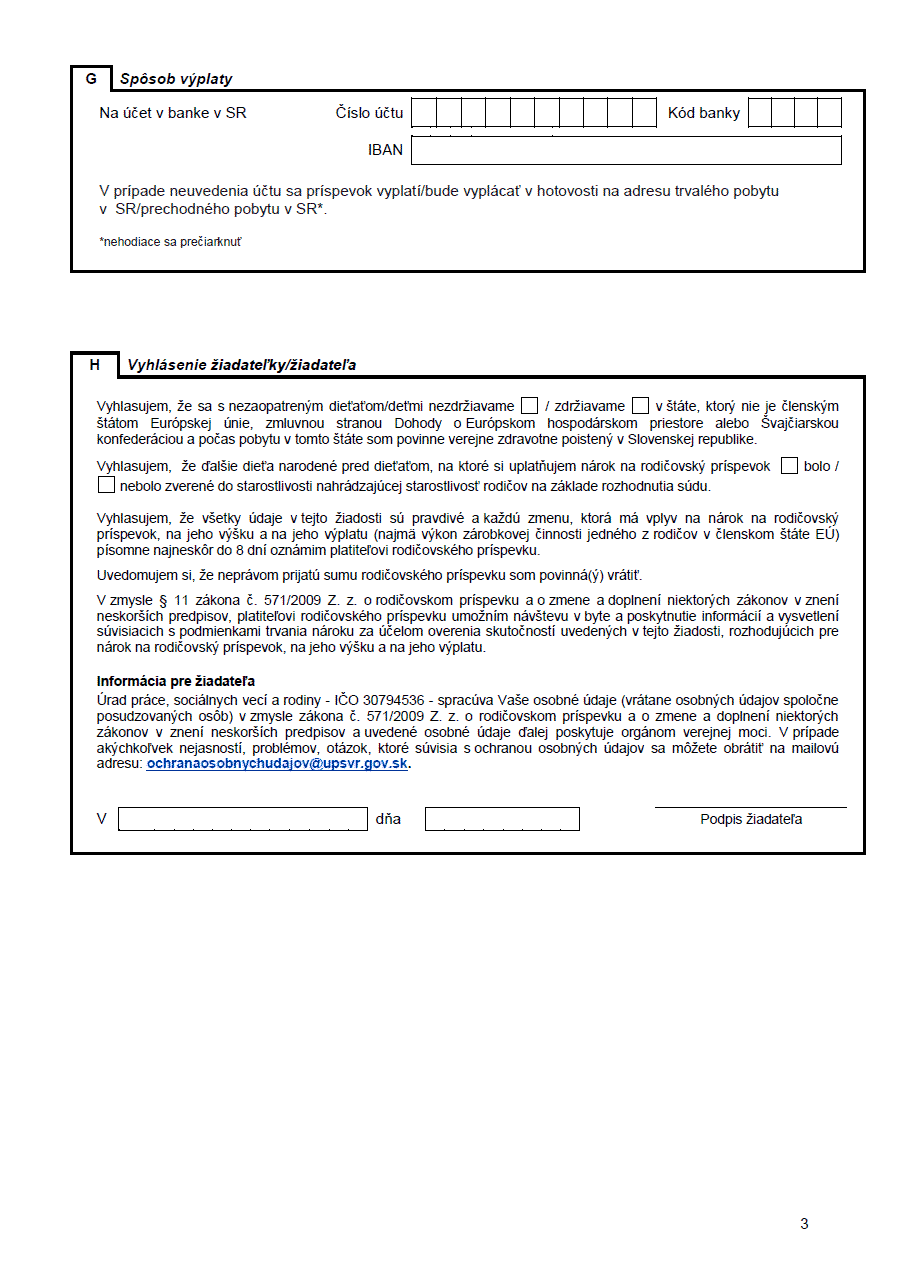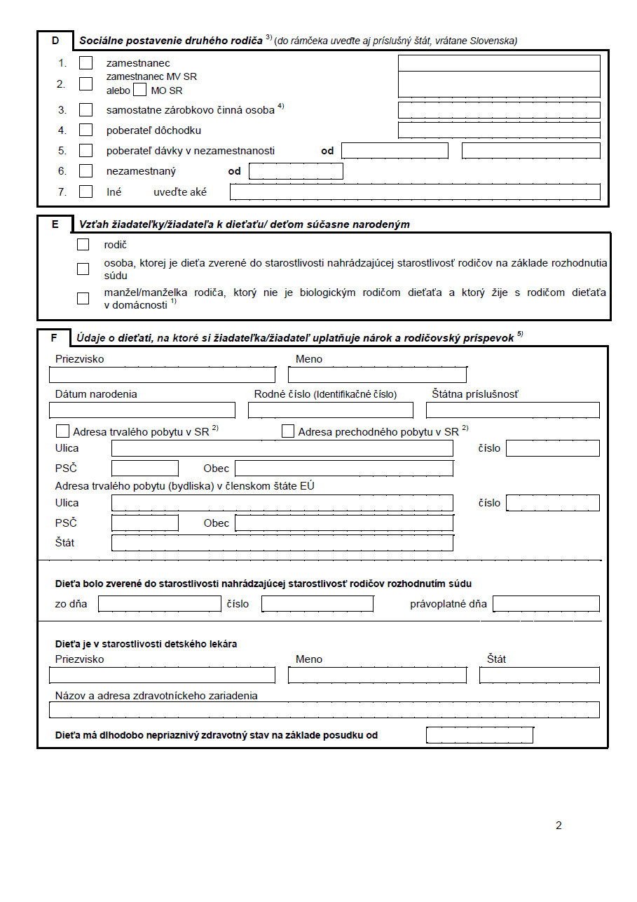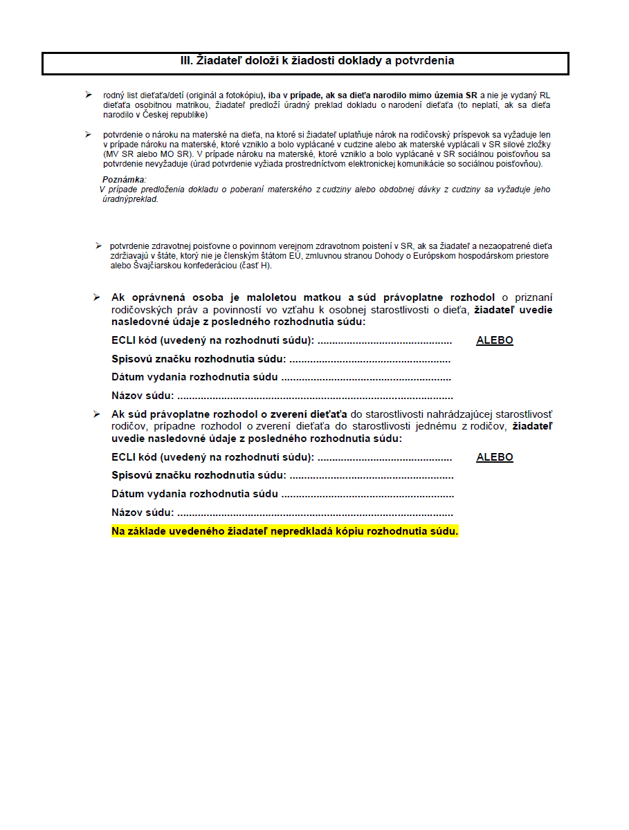Súvisiace tlačivá sú Žiadosť o prídavok na dieťa, Žiadosť o poskytnutie rodič. dovolenky, Potvrdenie o návšteve ZŠ, Potvrdenie o návšteve SŠ a VŠ a Potvrdenie o návšteve školy (bonus).