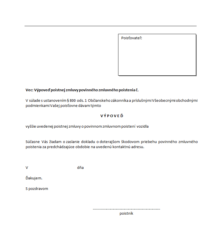 Pre výpoveď iného typu poistnej zmluvy môžete použiť univerzálnejšie tlačivo Výpoveď poistnej zmluvy.